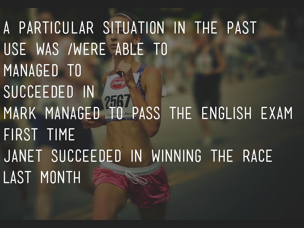 Ability on one occasion - successful. When we talk about achieving something on a specific occasion in the past, we use was/were able to (= had the ability to) and managed to (= succeeded in doing something difficult ). The burglar was able to get in through the bathroom window.