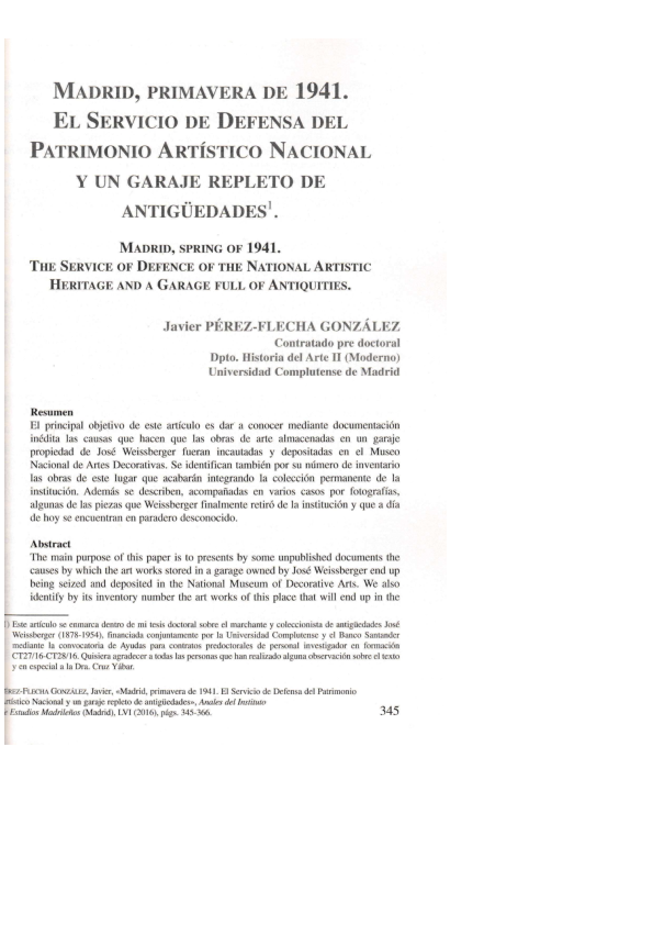 Madrid, primavera de 1941: el servicio de Defensa del Patrimonio Artístico Nacional y un garaje repleto de antigüedades. Autores: Javier Pérez-Flecha González Localización: Anales del Instituto de Estudios Madrileños, ISSN 0584-6374, Nº. 56, 2016, págs. 345-366 Idioma: español Títulos paralelos: Madrid, spring of 1941: the Service of Defence of he National Artistic Heritage and a.