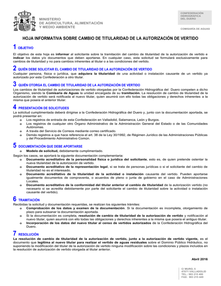 Cambio de titularidad autorización de vertido