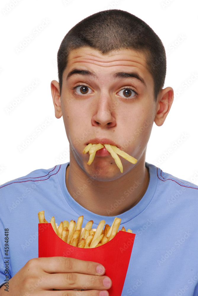 Niño contento comiendo patatas fritas,papas fritas. Stock Photo Adobe Stock