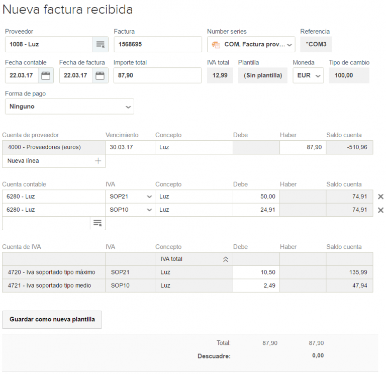 Cómo contabilizar facturas de proveedores desde Contasimple. Si usas Contasimple para llevar tu facturación, para registrar la factura de tu proveedor haz clic en «Contabilizar fact. recibida» tal y como se muestra en esta imagen de la pantalla de inicio: Llegarás a esta pantalla con tu plantilla para registrar la factura de tu proveedor.