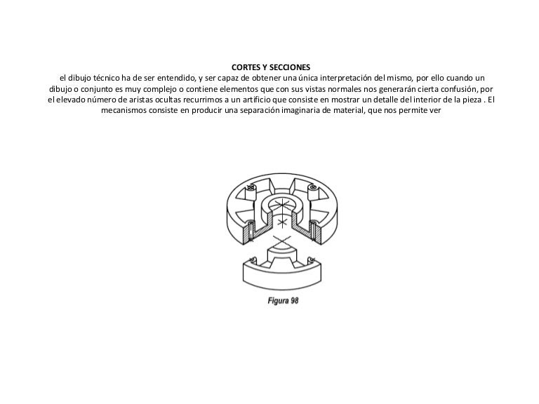 Cortes y secciones. Cuando un dibujo o conjunto es muy complejo o contiene elementos que con sus vistas normales nos generarán cierta confusión recurrimos a un artificio que consiste en mostrar un detalle del interior de la pieza mediante cortes o secciones. El objeto que tienen los cortes o secciones es hacer visibles aquellas partes.