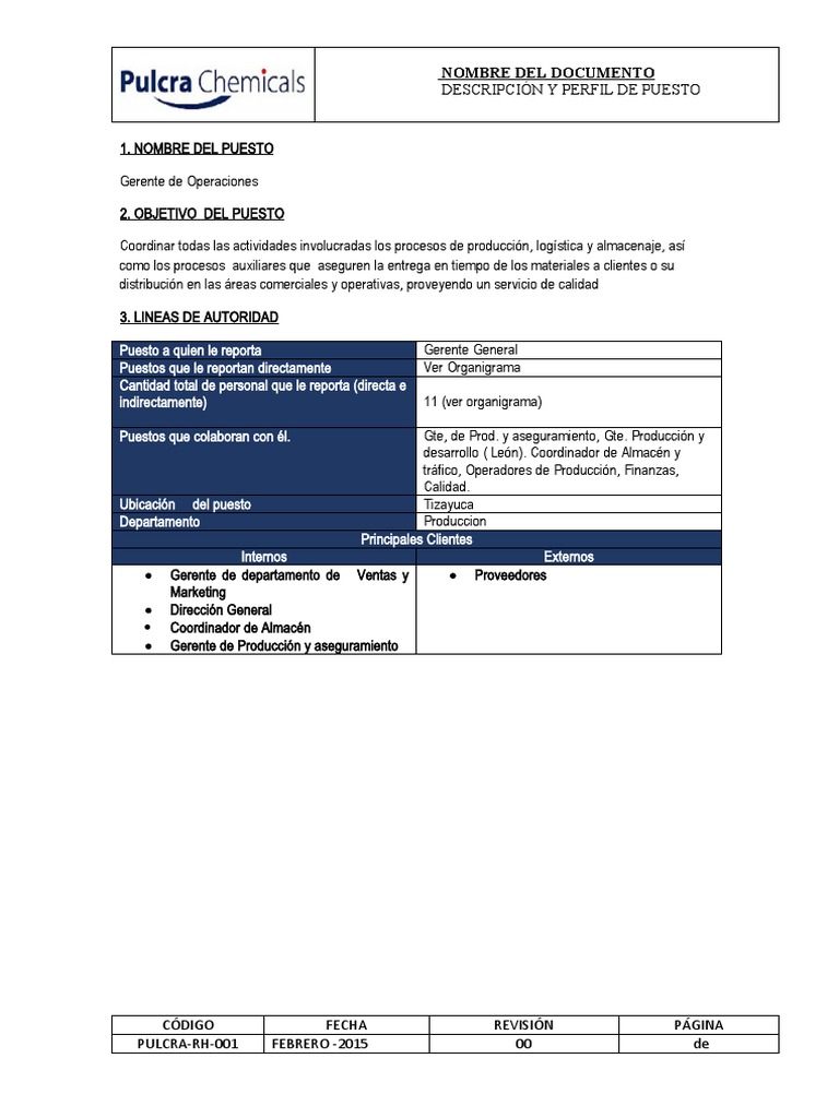 FORMATO DE DESCRIPCIÓN DE PUESTOS Gerente de Operaciones PDF Calidad Logística
