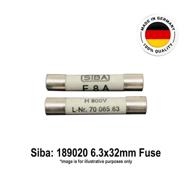 2A 500V 6X32 FAST. The SIBA 189020.2 fuse is part of their 189020 series. This fuse is a quick acting, ceramic cartridge fuse with nickel plated brass end caps. SIBA 189020 Series Datasheet. SIBA 189020.2 fuses. National Fuse carries a large SIBA fuse inventory. Same day shipping, great pricing and technical support.