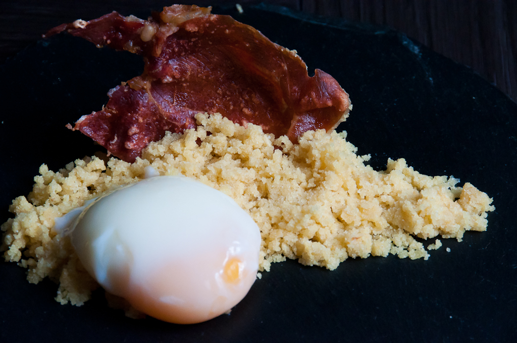Chafardeando en la cocina Huevo a baja temperatura con migas de patata chips y crujiente de jamón