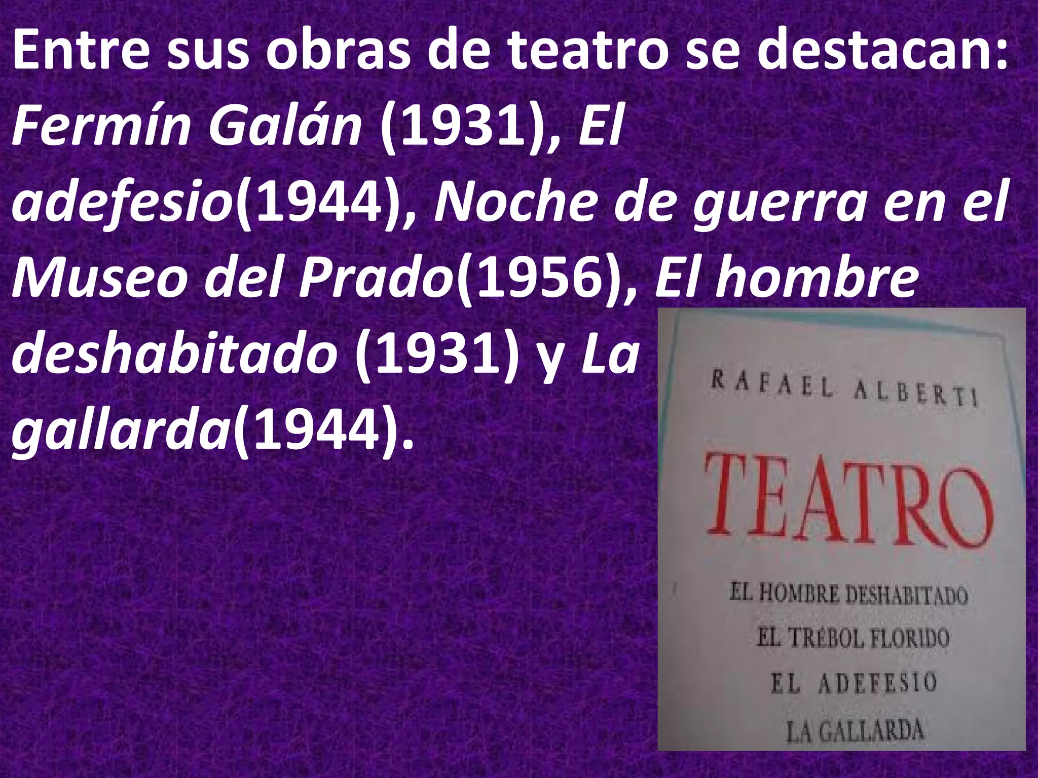 La aventura teatral de Rafael Alberti. Marcos Ordóñez. Oct 03, 2003 - 18:00 EDT. 1. Seix Barral ha emprendido una labor admirable: la edición de la obra completa de Rafael Alberti, cuyo primer.