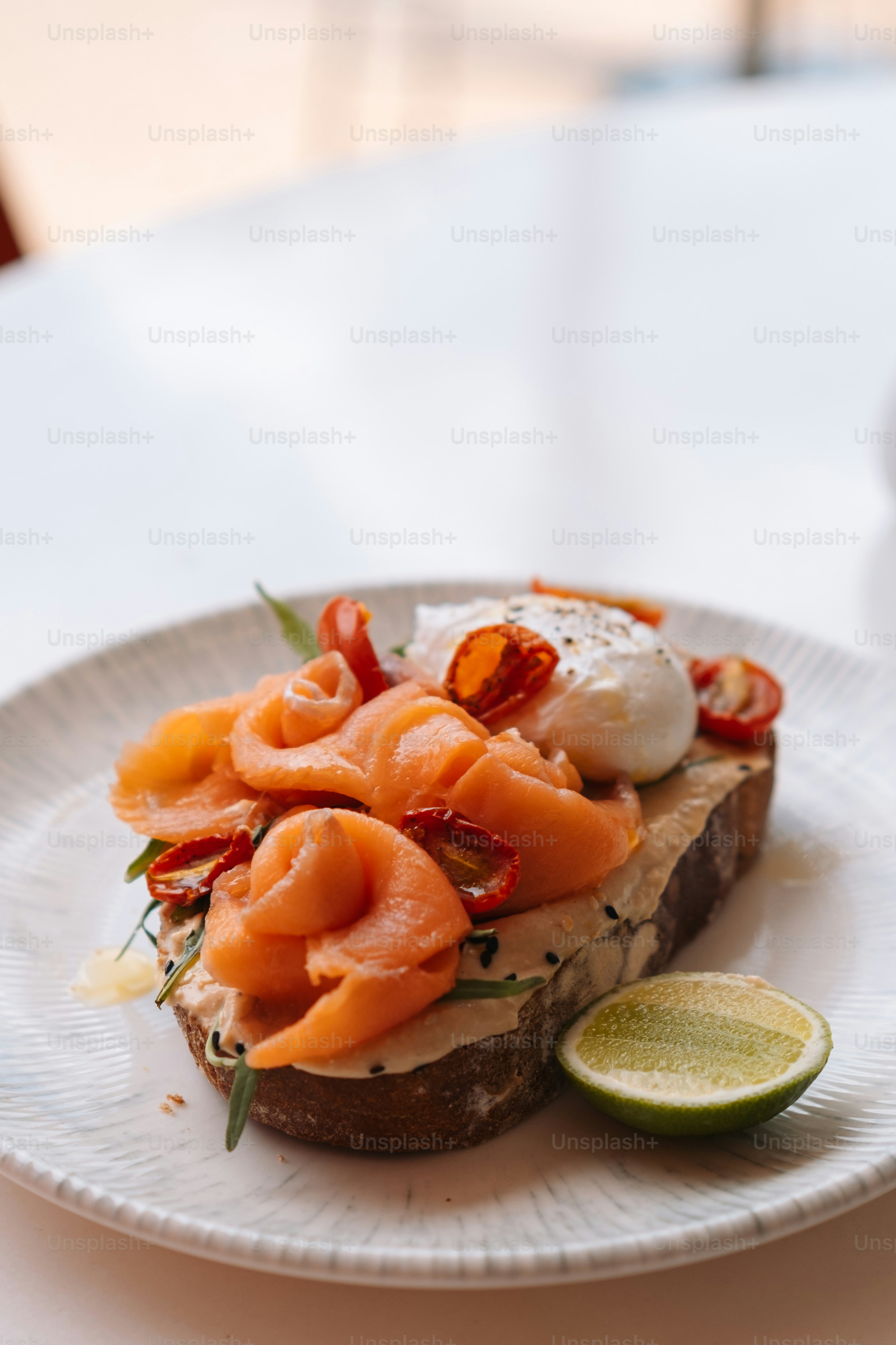 Foto Un plato blanco cubierto con un pedazo de pan cubierto de salmón