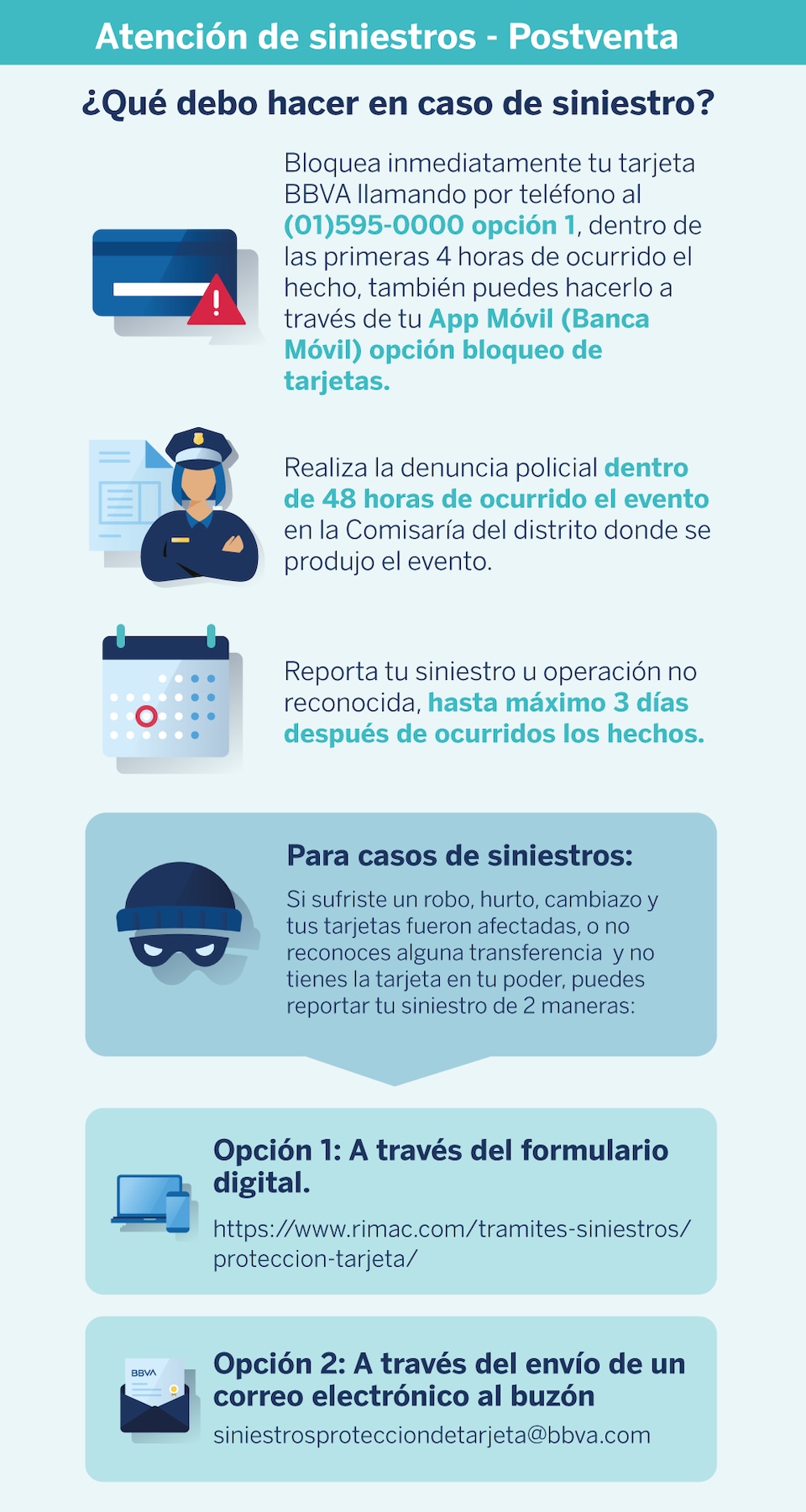 Estas son algunas de sus coberturas y beneficios: Protección ante el uso forzado de tu tarjeta por robo. Protege las compras que realices con tus tarjetas BBVA ante robo. Reembolso hasta por US$ 250 por trámite de tus documentos robados. Cobertura por compra fraudulenta por internet. Reembolso de gastos médicos por hospitalización a.